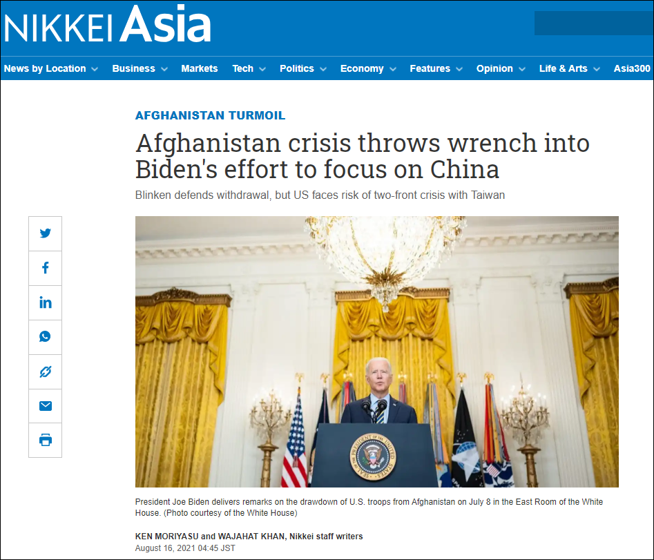 《日经亚洲》8月16日发表评论称,“阿富汗危机令拜登专注于中国的努力受挫”。